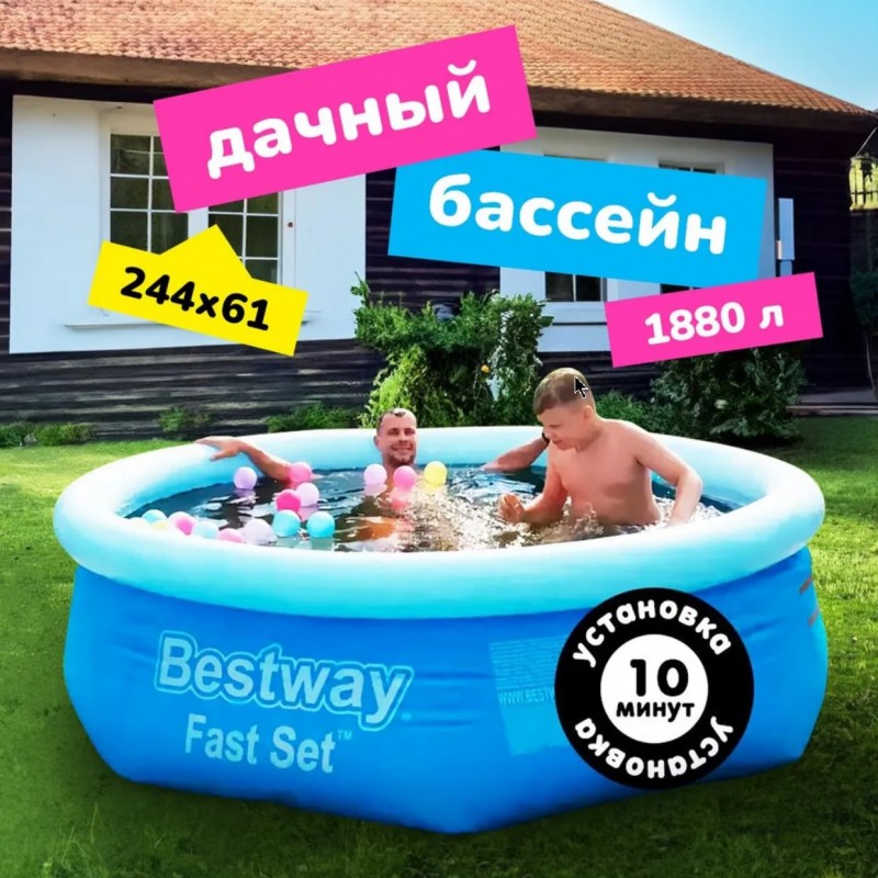 Бассейн Bestway Fast Set - это идеальное решение для летнего отдыха на даче или во дворе дома. Бассейн надувной имеет диаметр 244 см и высоту 61 см, удобное пространство позволяет свободно купаться и играть. Надувной бассейн имеет вместительность 1880 литров, что является отличным выбором для всей семьи, так как бассейн и детский, и взрослый. Дети будут в восторге от возможности плескаться в своем собственном бассейне, а взрослые смогут насладиться прохладой в жаркий день.